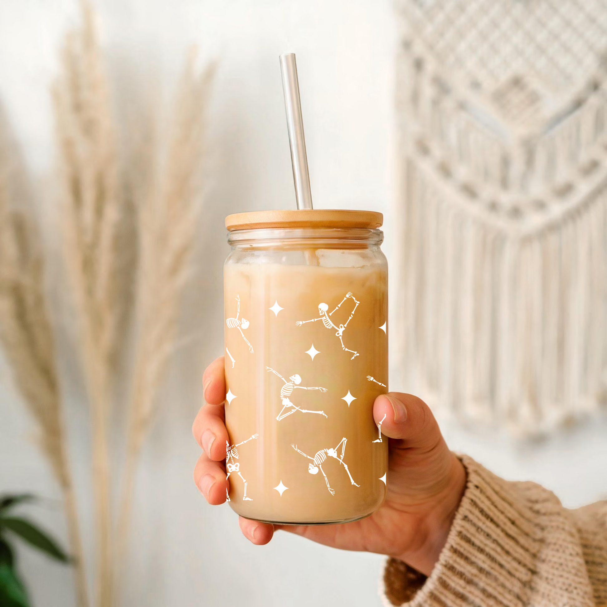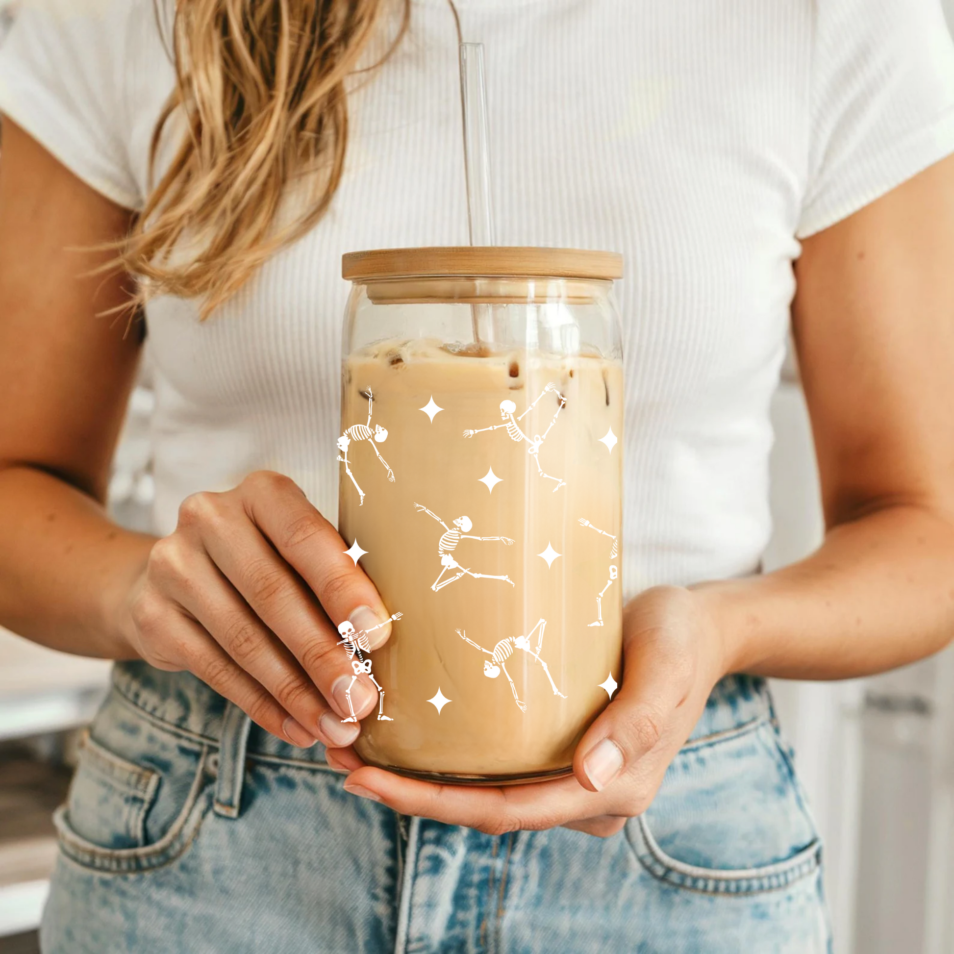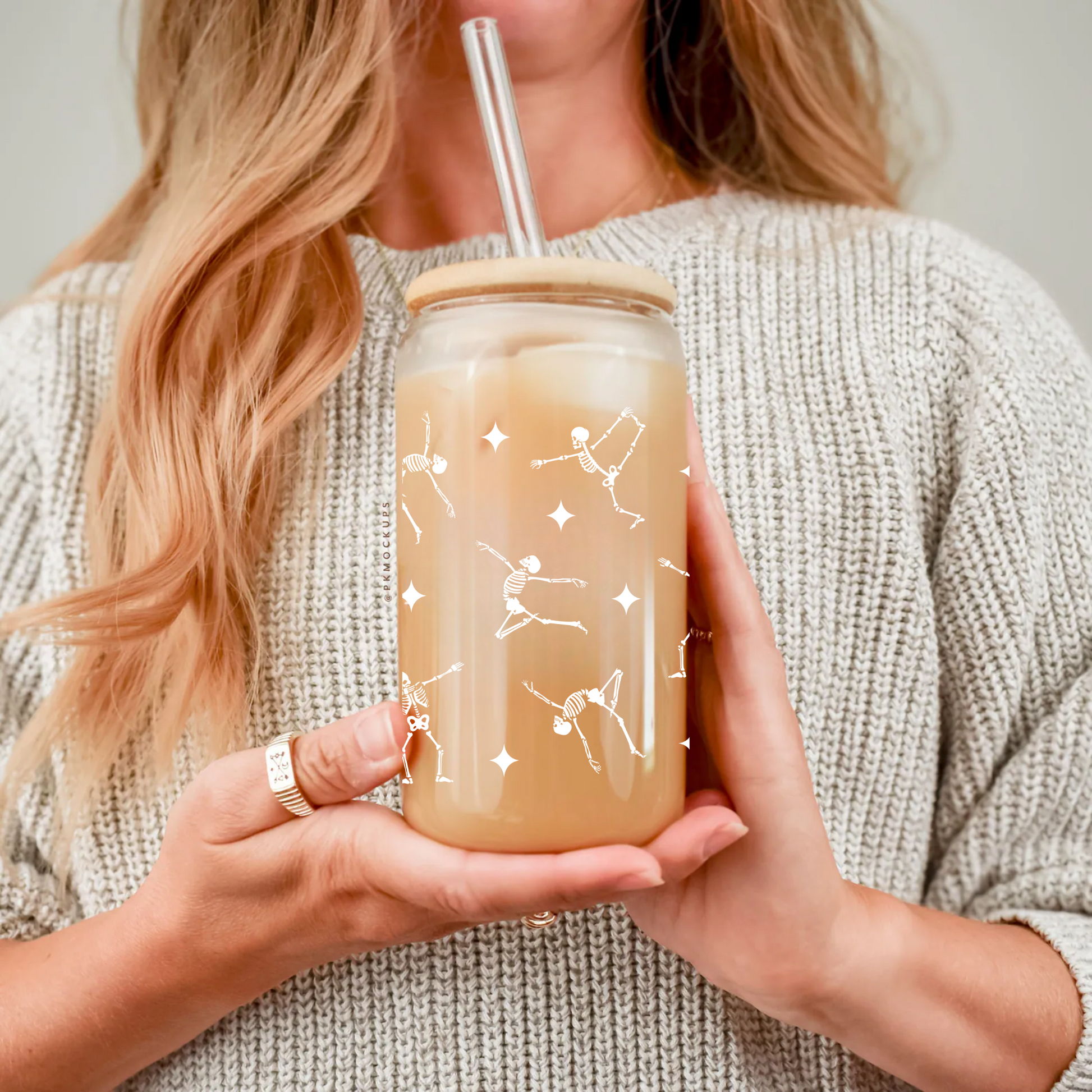 Celebrate Halloween with the White Skeletons Dancing Glass Tumbler, expertly crafted to elevate your spooky season gatherings. This striking glass features detailed white skeletons in lively dance poses, adding a playful yet eerie charm to your drinkware collection.